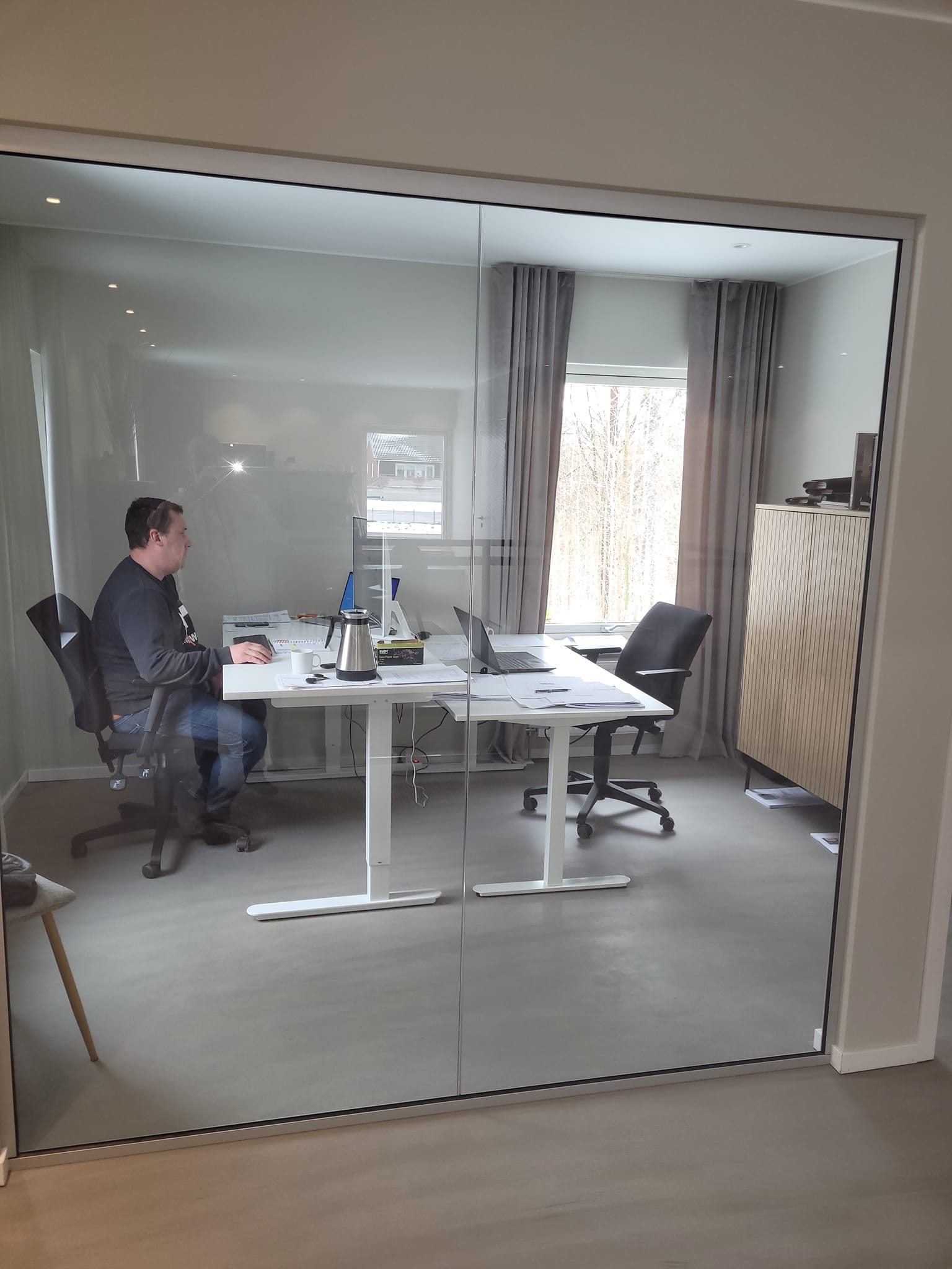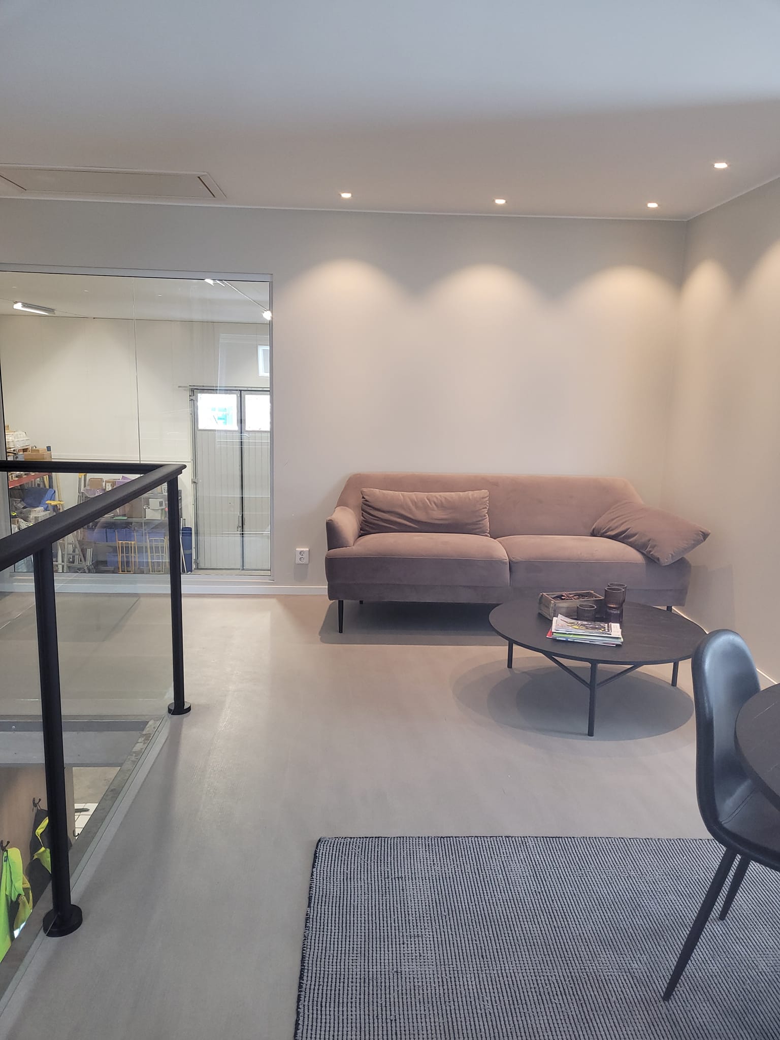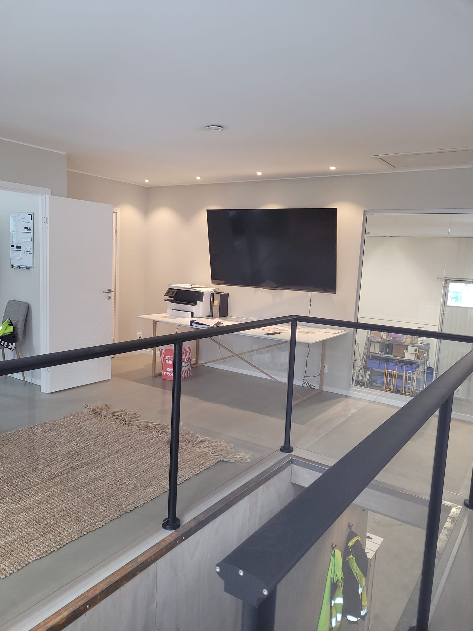 Projektet på entresolen omfattar ett kontor, kök och en mötesplats för kunder och personal. Hållbara material har valts för att skapa ett funktionellt och estetiskt arbetsmiljö.